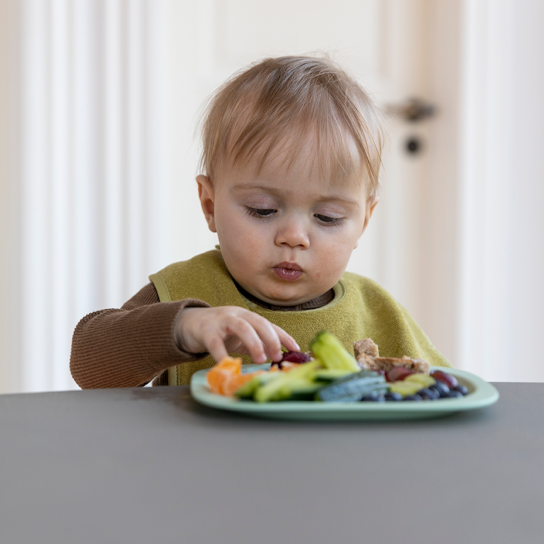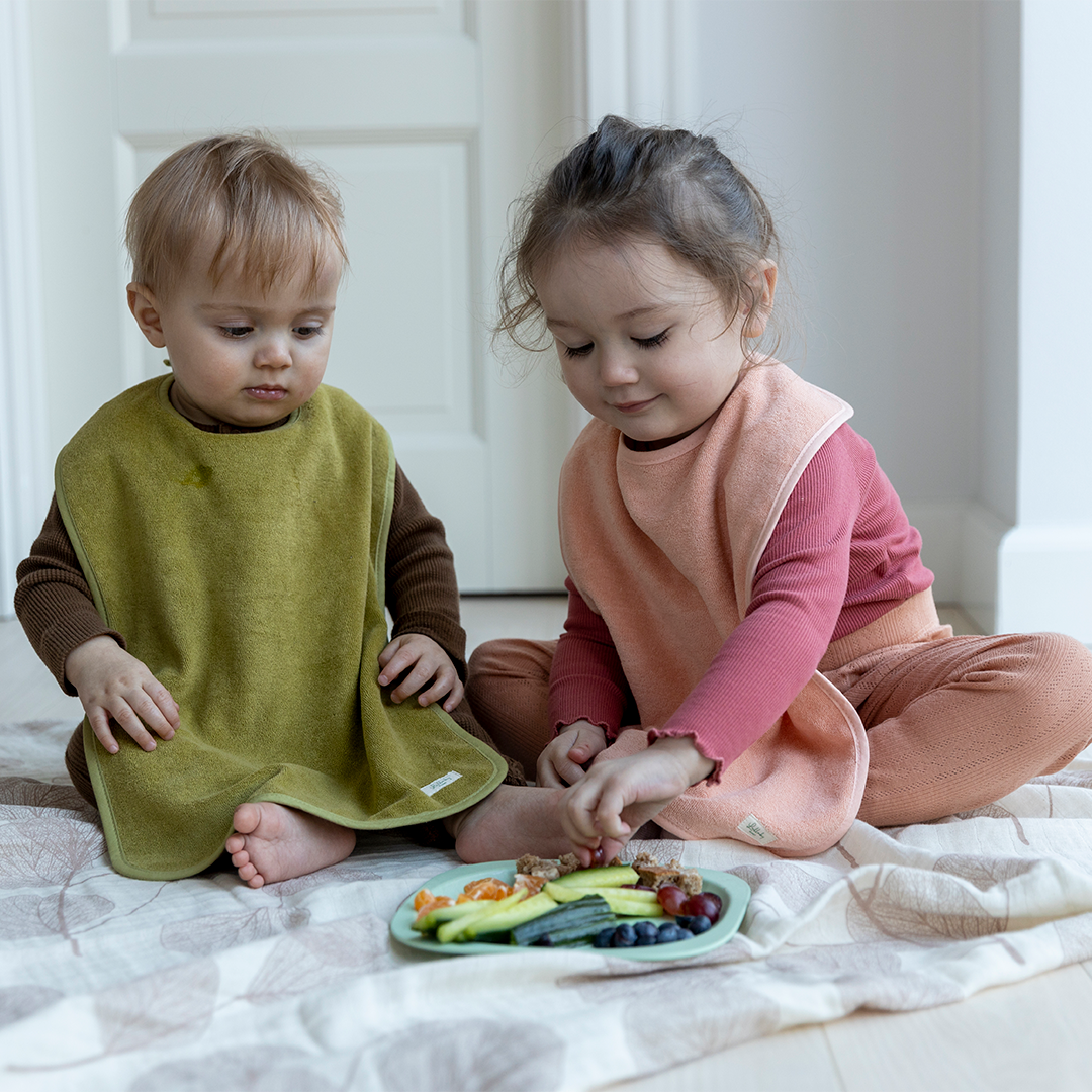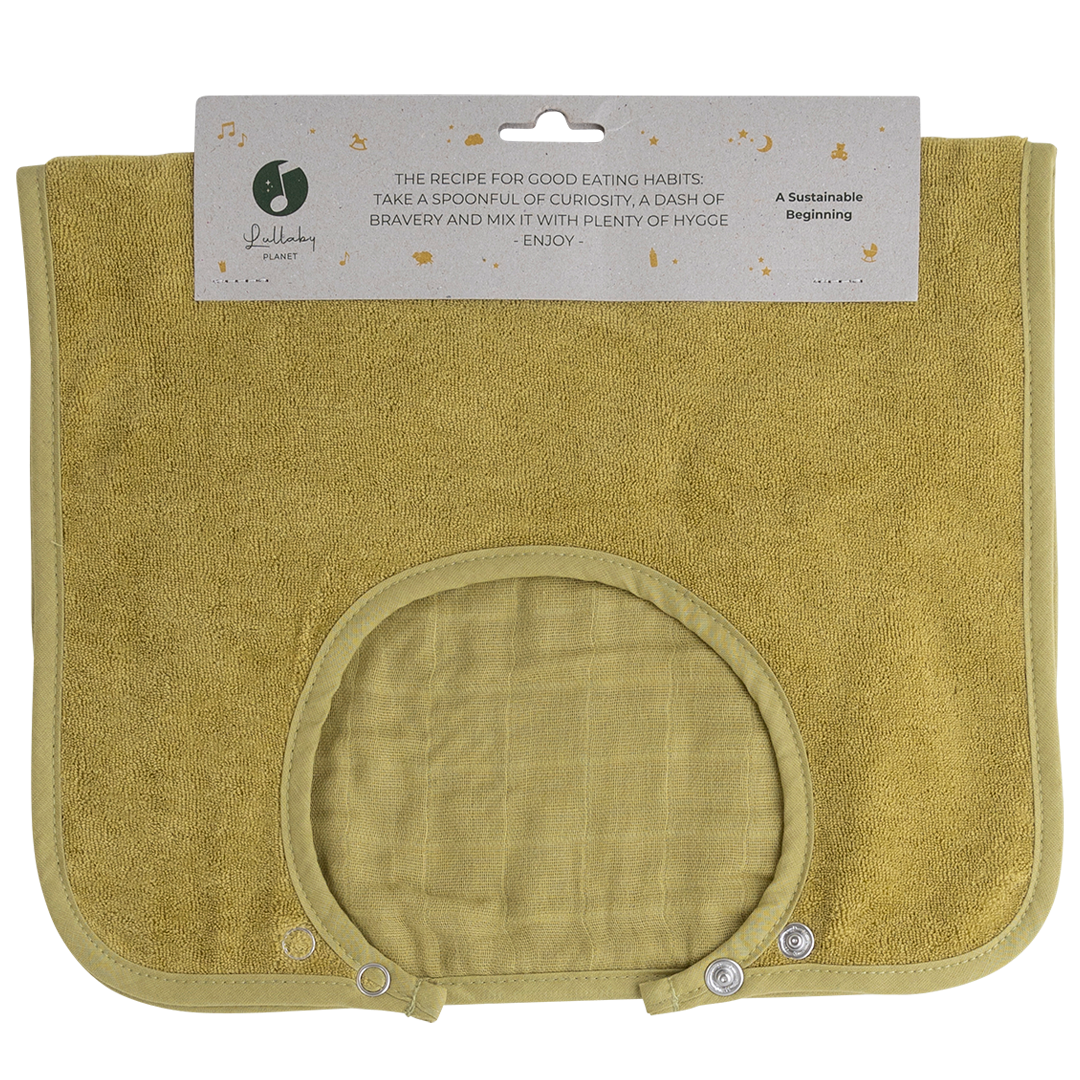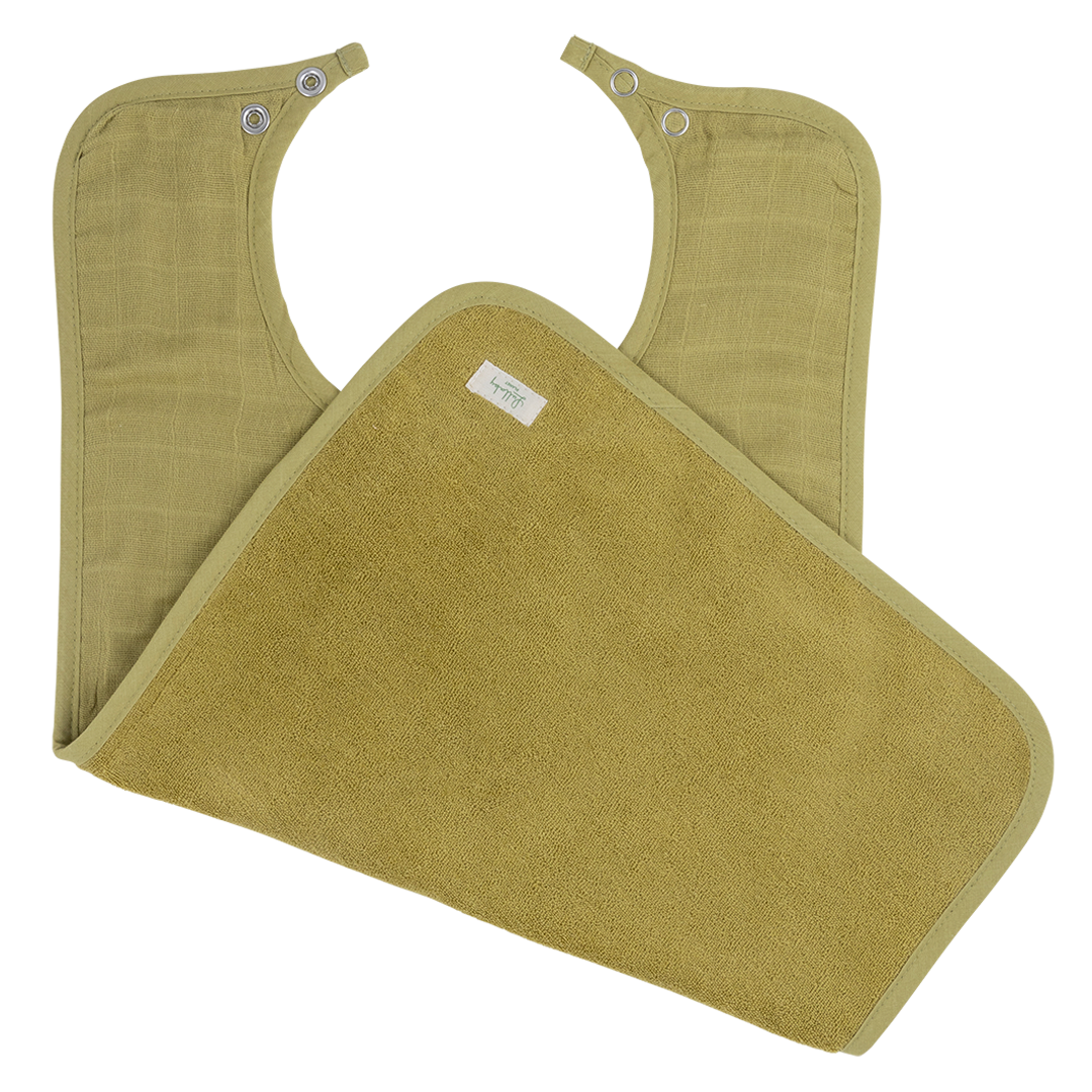 Această bavetă frumoasă 100% din bumbac organic certificat GOTS este foarte lunga, astfel încât să poată prinde toate firimiturile. Fata este din muselina de bumbac extra moale, in timp ce spatele este din bumbac. Tesatura moale face baveta foarte confortabila. Datorita compozitiei materialului, bavetele sunt foarte absorbante.