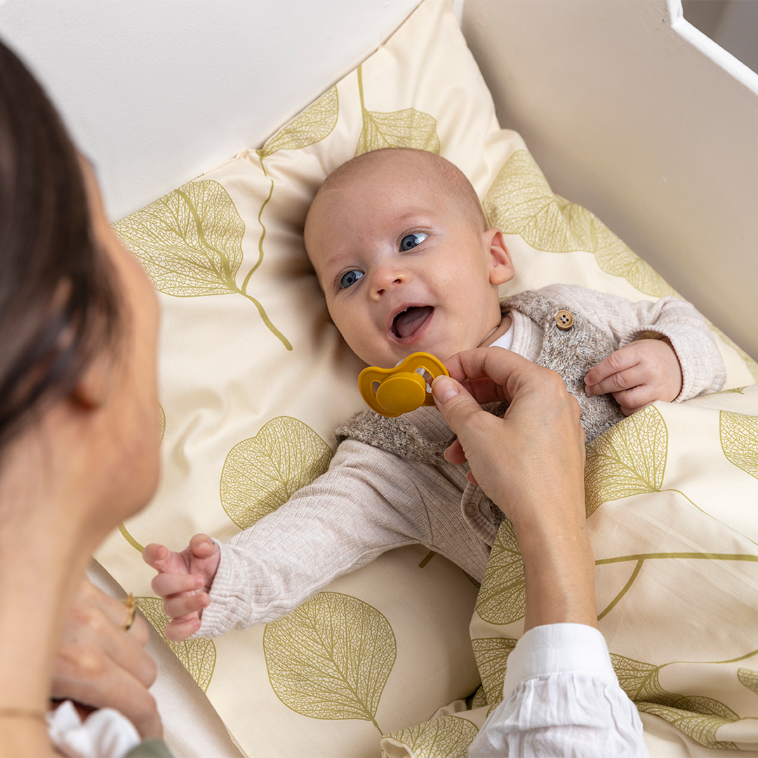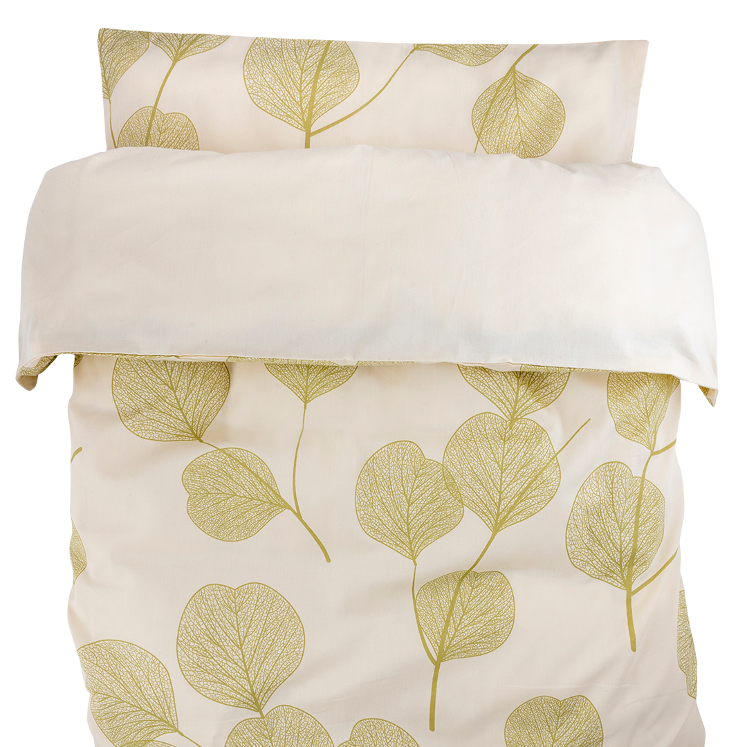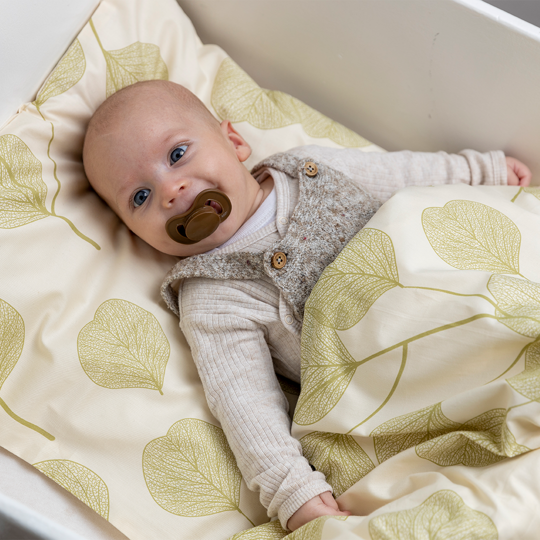 Lenjeria de pat este realizată 100% din bumbac satinat organic moale certificat GOTS, care permite pielii copilului să respire și îl însoțește confortabil pe tot parcursul nopții. Designul frumos, cu frunze fine de pe partea din față a lenjeriei de pat vă invită să visați. Spatele lenjeriei de pat este neimprimat.
