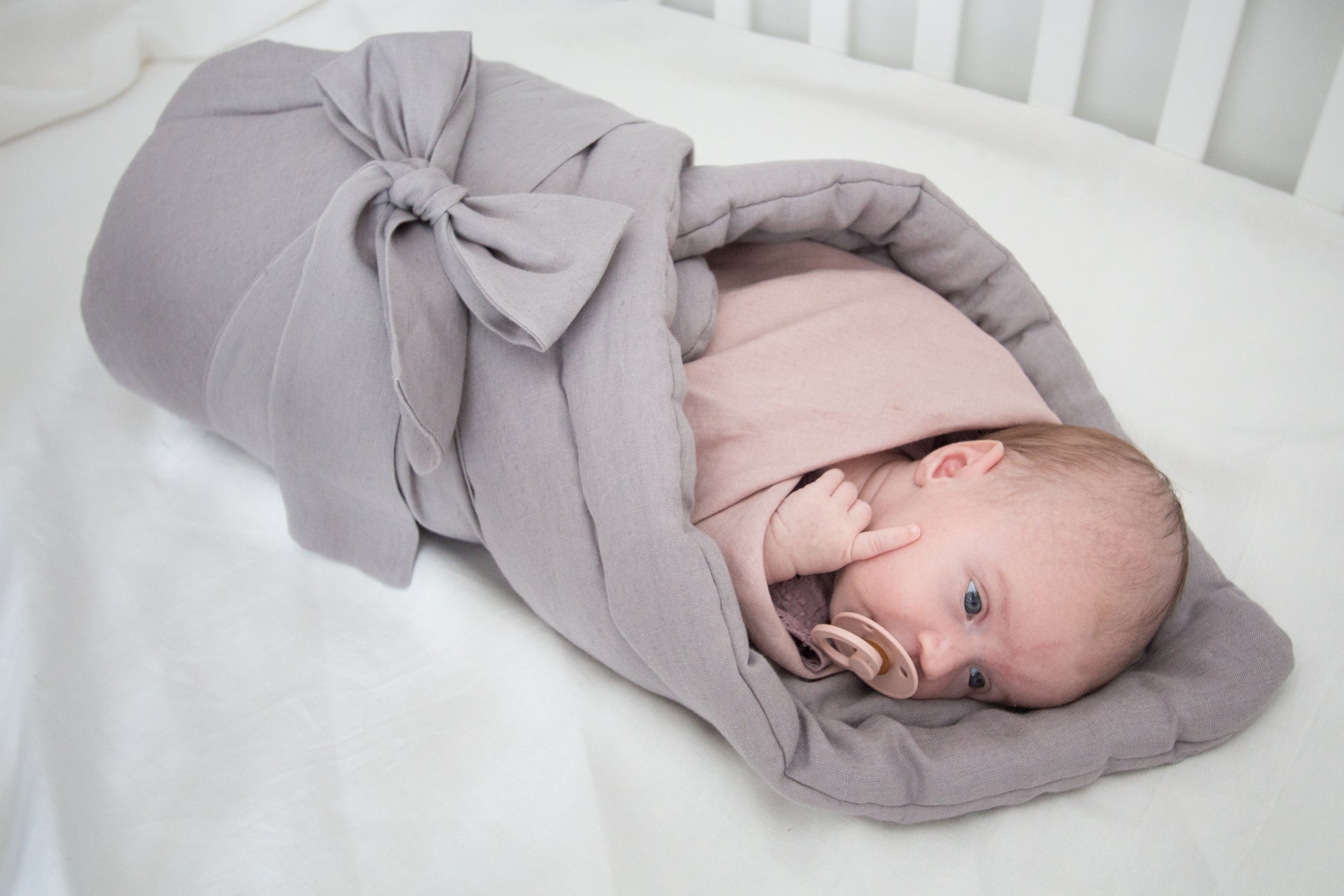 Potrivita din primele momente ale vietii bebelusului, confectionata dintr-o panza moale in care bebelusul se v-a simti in siguranta. Interiorul contine silicon, material antialergic. Panglica mare si frumoasa va permite sa legati o funda oricum doriti. De asemenea, poate fi folosita ca paturica, cuvertură sau saltea de joaca. Produsul trebuie utilizat sub supravegherea unui adult.